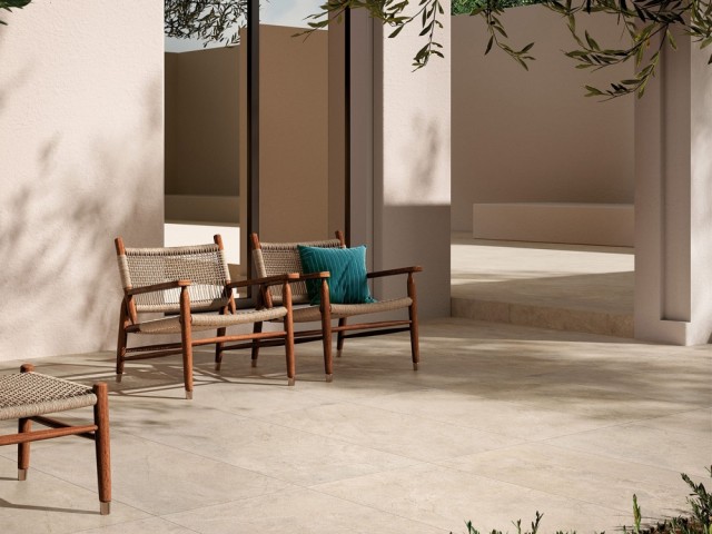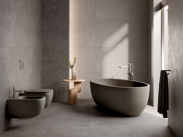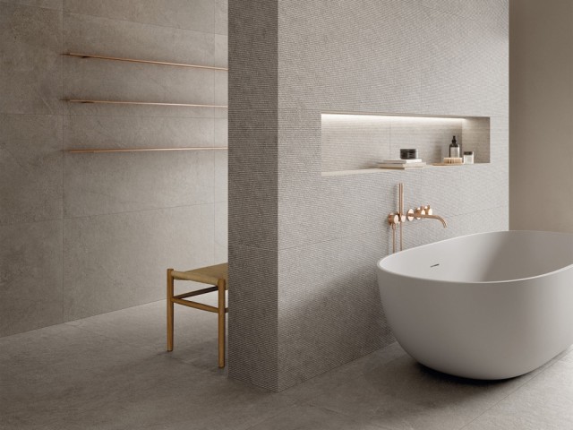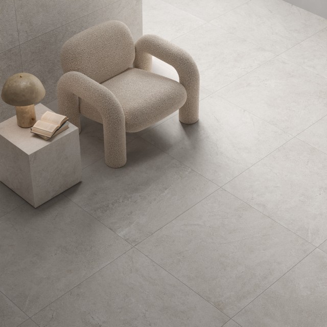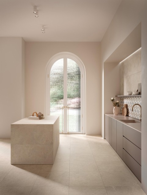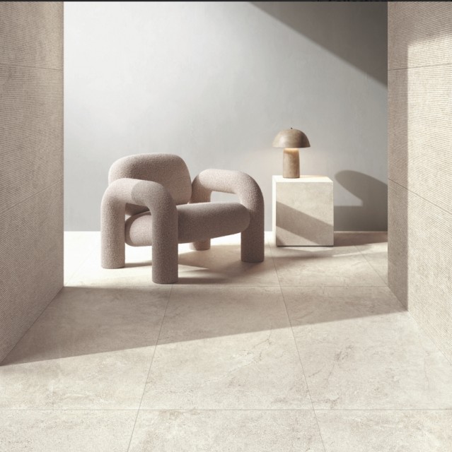 En stemningsfull tolkning av kalkstein i delikate moderne fargetoner, for enkle og strenge, intime og elegante oppholdsrom. Atmosfærer reddet fra tidens gang, vibrerende med ekte materialfornemmelser.